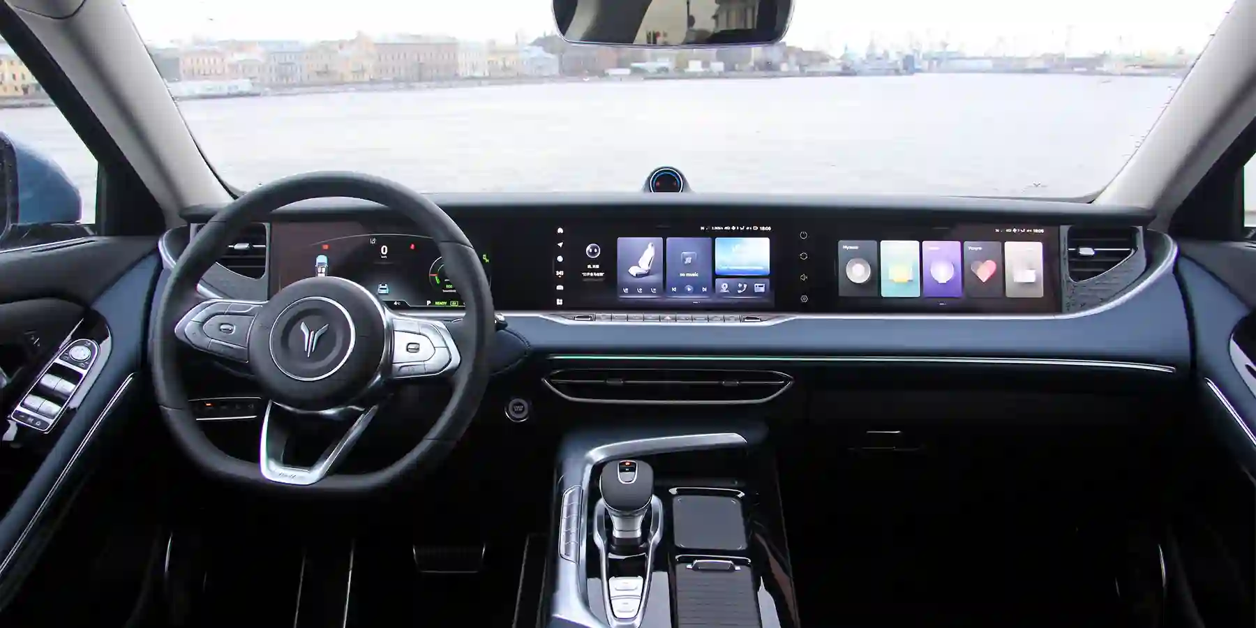 Несмотря на стандартную архитектуру, тот, кто сядет в салон впервые — ахнет! У машины подвижная передняя панель с тремя экранами — она поднимается из недр под лобовым стеклом. Вещь бесполезная, но очень эффектная. Нет никаких нареканий и на отделке — сделано все крайне добротно, местами богато. Даже стеклянная крыша с изменяемой прозрачностью — такие ставили на «Майбахи». Единственное, и тут сэкономили на задних пассажирах — ни медиасистемы, ни климата, ни даже подогревов.